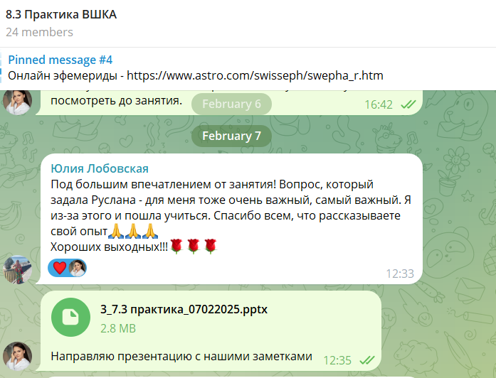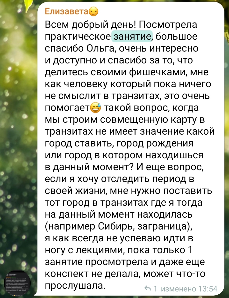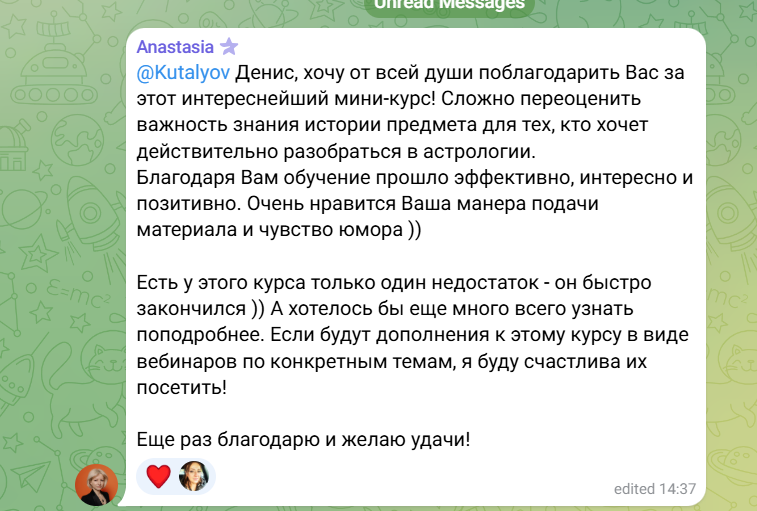 «Выражаем огромную благодарность нашему преподавателю — Александру Айчу! Спасибо, что все эти годы он делился с нами своими бездонными знаниями и разжигал огонь любви к Астрологии. Благодарим его за то, что был рядом и шел навстречу нашим ураническим идеям. Александр открыл для нас безграничную глубину эзотерических знаний и заинтересовал манящим новым миром. Из океана информации наш преподаватель, как проводник, доставал самое интересное, и что важно, преподносил знания с юмором и азартом первооткрывателя. А для новых студентов хочется отметить: обучение у Александра полезно, потому что, кроме знаний, получаешь инструменты их использования — методы и техники анализа разных типов карт, знание подходов к работе с клиентами. По итогам пройденного обучения мы ощущаем себя выпускником ВУЗа, а не школы, так как, хочется отметить высокий уровень информации, в том числе исторический срез и древние интереснейшие методики. С Уважением, Вера Фирулина и выпускники 2023 года обучения группы А. Айча. 15.12.2023»